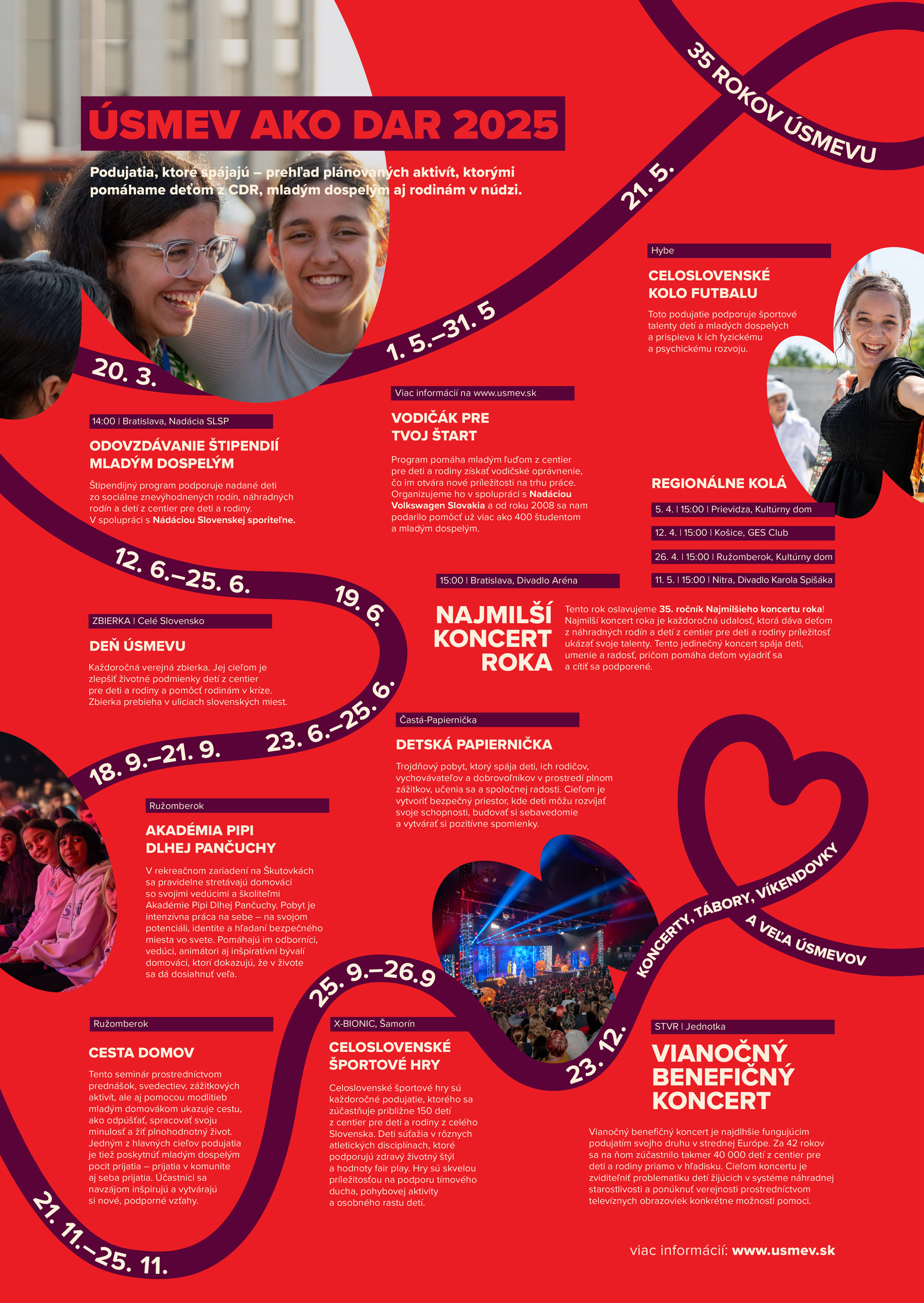 Práve dobrovoľníci boli kedysi tí, ktorí začali písať našu históriu. Boli to oni, ktorí začali pracovať s deťmi v detských domovoch, dnešných centrách pre deti a rodiny (CDR). Dobrovoľníci sú dodnes neoddeliteľnou súčasťou programov a projektov Spoločnosti Úsmev ako dar. Pridaj sa k nám!